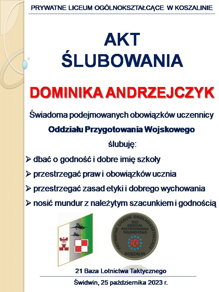 W związku z planowanym udziałem uczniów 1 i 2 klasy Oddziałów Przygotowania Wojskowego i klas wojskowych w dniu 14 października 2023 roku w szkoleniu Trenuj z wojskiem sam i w grupie”  organizowanym w 8. Pułku Przeciwlotniczym w Koszalinie przy ul. IV Marca 3 informujemy, że należy zabrać ze sobą :